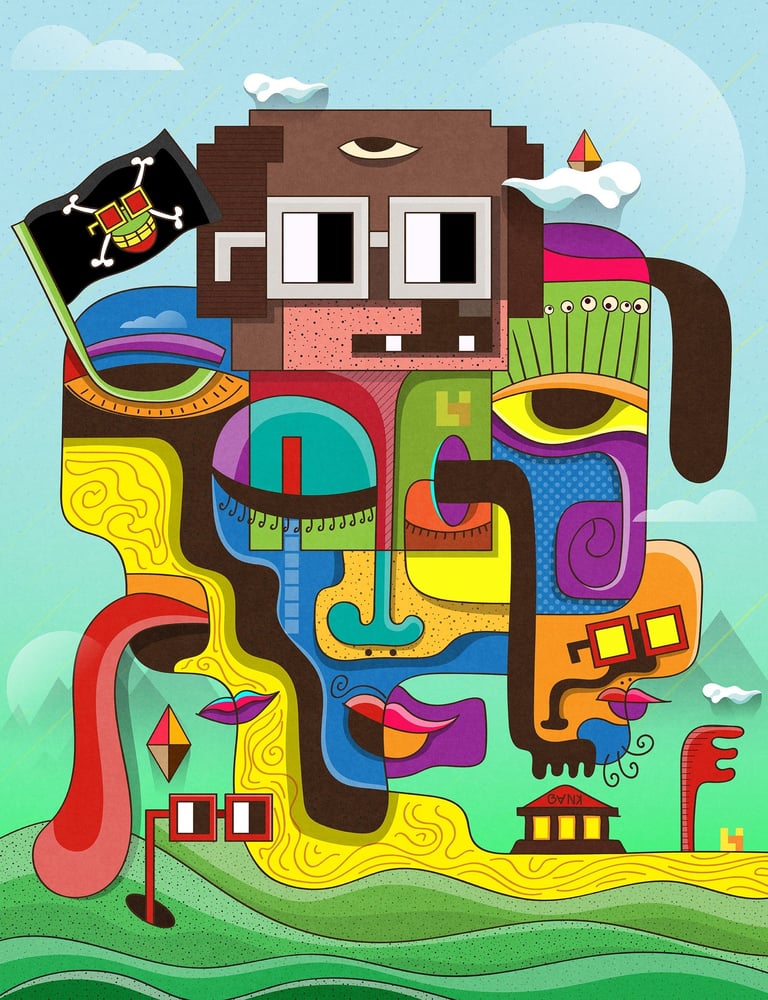 This work was born from a process of drawing without a plan, lines, shapes, and colors were left to flow freely, forming an absurd visual world full of character. The initial inspiration came from Noun 1673, but it later evolved into a wild interpretation with fragmented faces, random symbols, and imaginative landscapes that seem to come alive on their own.